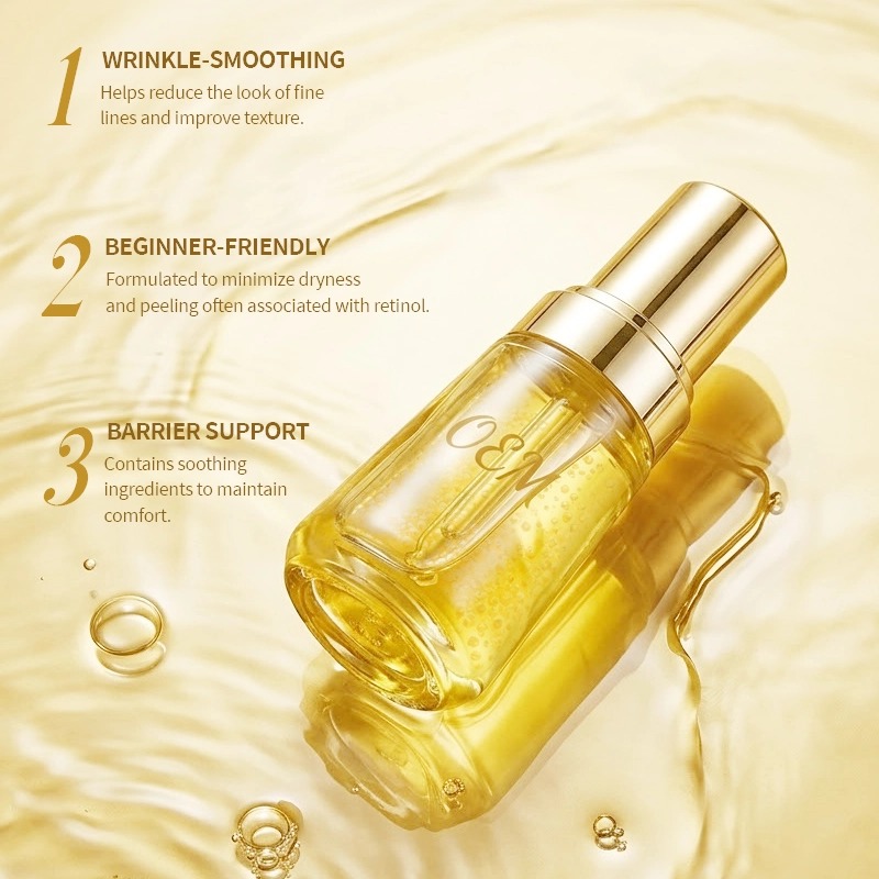Um sérum de retinol suave que realmente funciona para peles sensíveis. A tecnologia de microencapsulação proporciona uma ação de liberação prolongada, suavizando linhas finas, refinando a textura e uniformizando o tom da pele sem causar vermelhidão ou descamação. Ideal para quem usa retinol pela primeira vez. Com o respaldo de nossa equipe de P&D com doutorado e ambiente controlado de Boas Práticas de Fabricação (GMPC). Quantidade mínima de pedido baixa, amostragem rápida. Sua fórmula, sua embalagem.