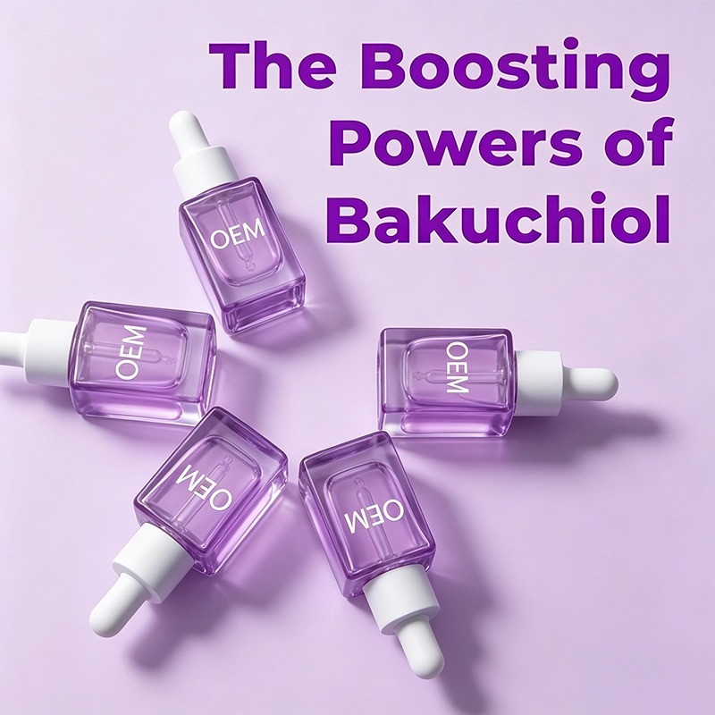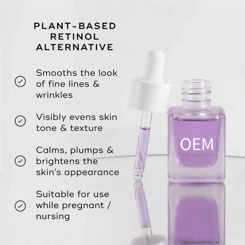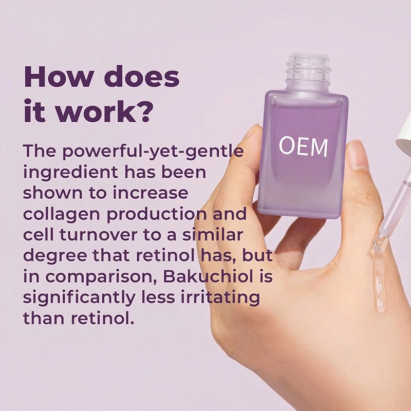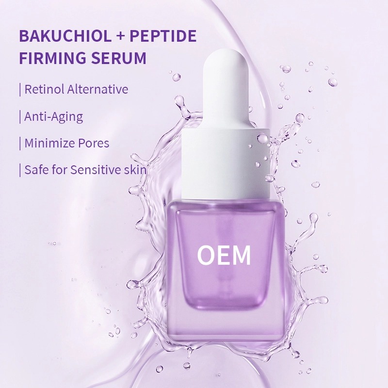 Um sérum firmador suave, à base de plantas, que ajuda a suavizar rugas e a promover a elasticidade da pele, sem a irritação do retinol. O bakuchiol e os peptídeos sinalizadores atuam em conjunto para melhorar a firmeza da pele, enquanto a fórmula leve é rapidamente absorvida. Ideal para peles sensíveis e para quem usa retinol pela primeira vez. Com o apoio de nossa equipe de P&D com doutorado e sala limpa GMPC. Personalização completa – fórmula, embalagem, fragrância, logotipo. Quantidade mínima de pedido baixa, amostragem rápida (15 dias). Aprovado por marcas nos EUA, Alemanha e Oriente Médio.